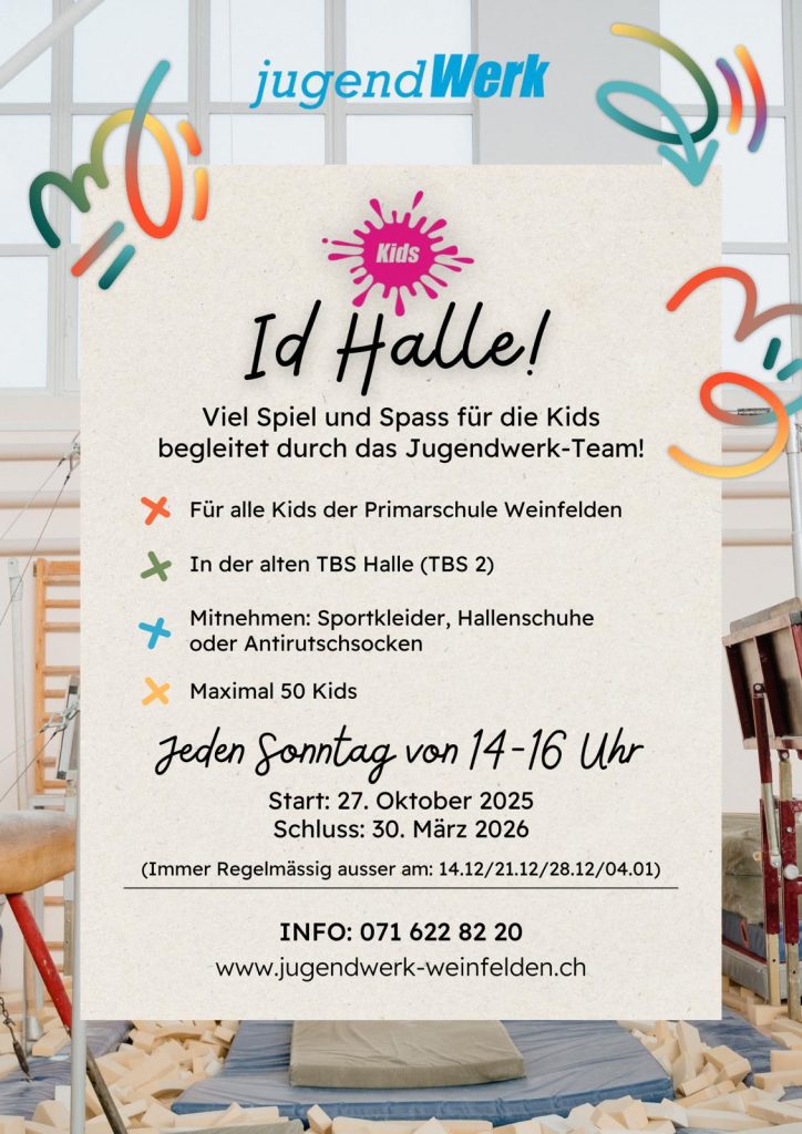 Von November bis Februar können alle Kinder der 1. bis 6. Primarklassen aus Weinfelden in der geöffneten Turnhalle spielen und neue Sport- und Freizeitaktivitäten entdecken. Dieses Angebot findet jeweils am Sonntag von 14:00 – 16:00 Uhr in der alten TBS Turnhalle statt. Eine Anmeldung ist nicht nötig.